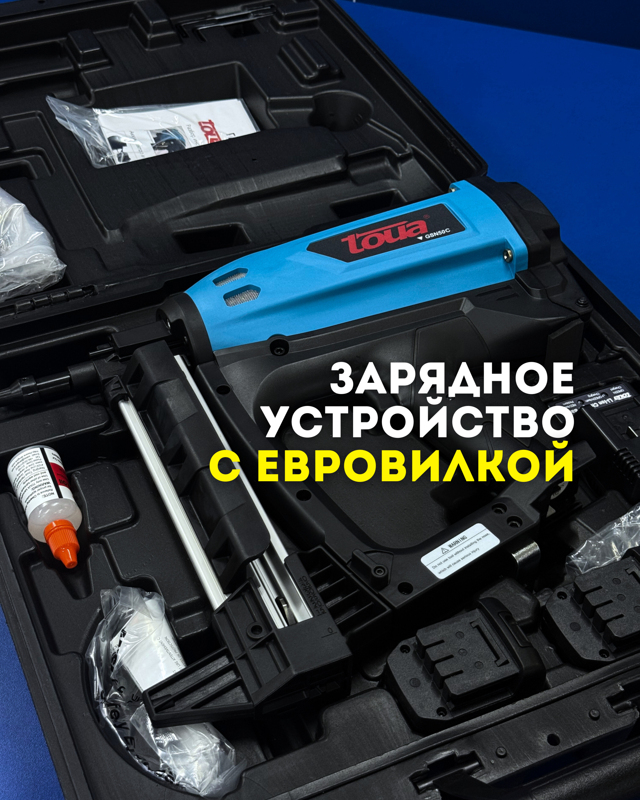 В комплекте 2 аккумулятора, рассчитанные на 4000 выстрелов каждый; установлены кожух и зауженная насадка для электромонтажа. Сменного газового баллона хватает на 1000 и более гвоздей.